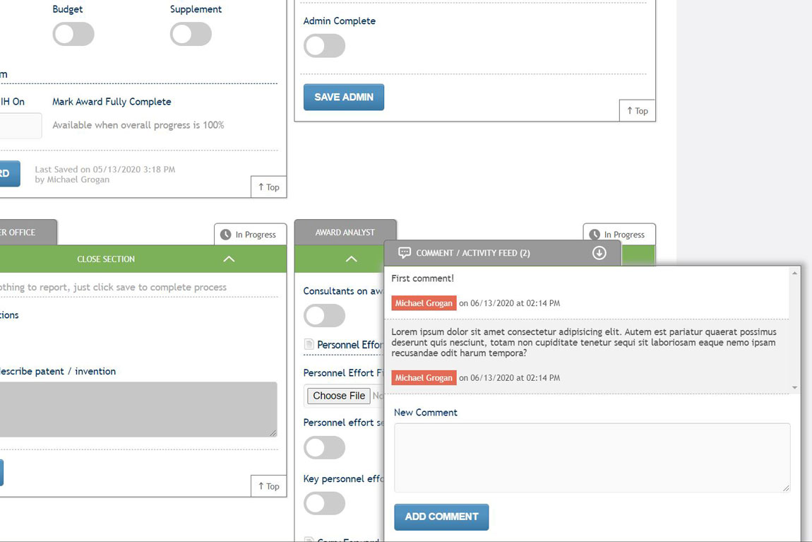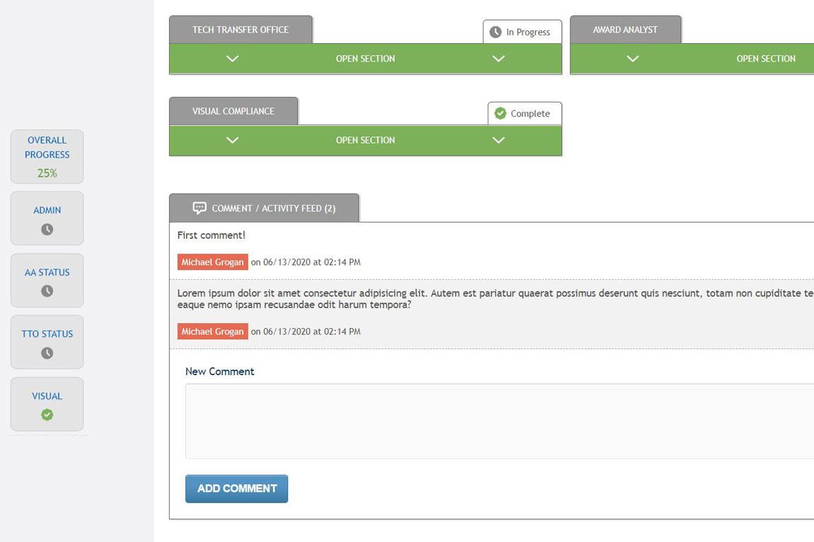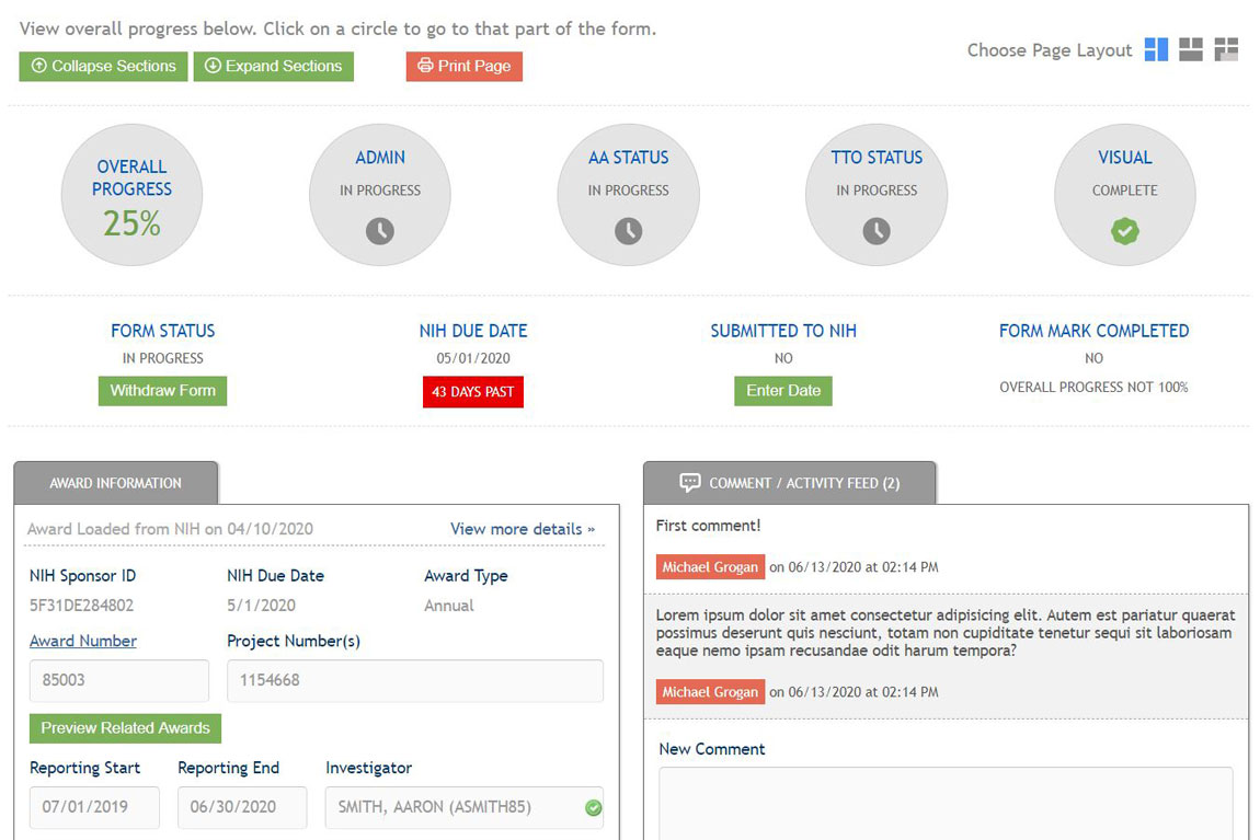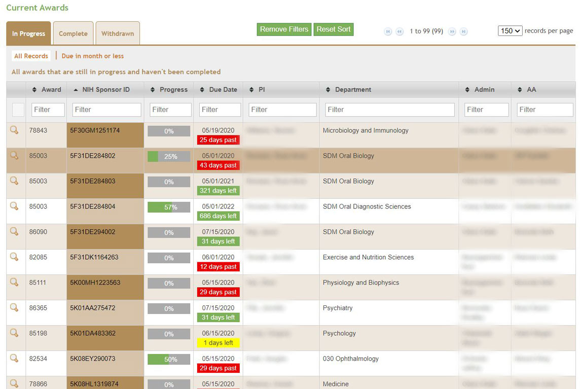 Designed for our Sponsored Projects office to track NIH awards that have annual submission requirements. NIH awards were scraped off their website instead of having anyone manually having to do it. There are between 5-8 sections that need to be completed in parallel. The site tracks all the work being done between multiple offices and multiple staff roles. Email reminders are sent when deadlines approach if work hasn't been completed. I came up with the idea of tracking the progress with a simple percentage to very quickly see how much work had been done to date. Application was created in the CFWheels framework.